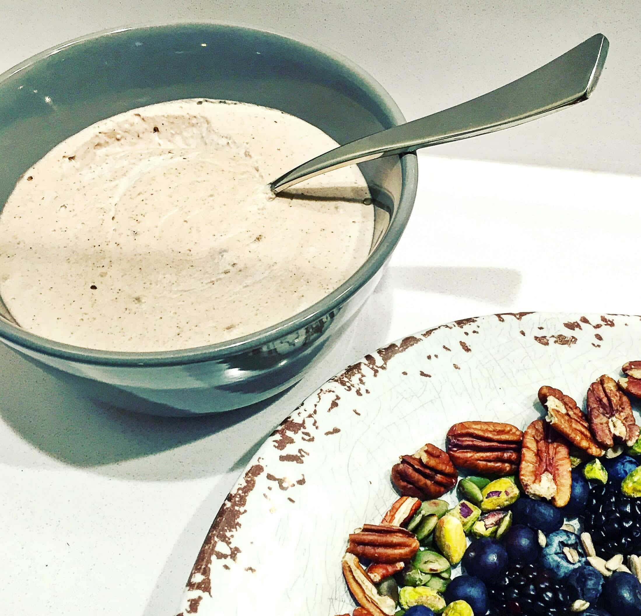 - Transfer almond yogurt to mixing bowl and cool using ice bath.