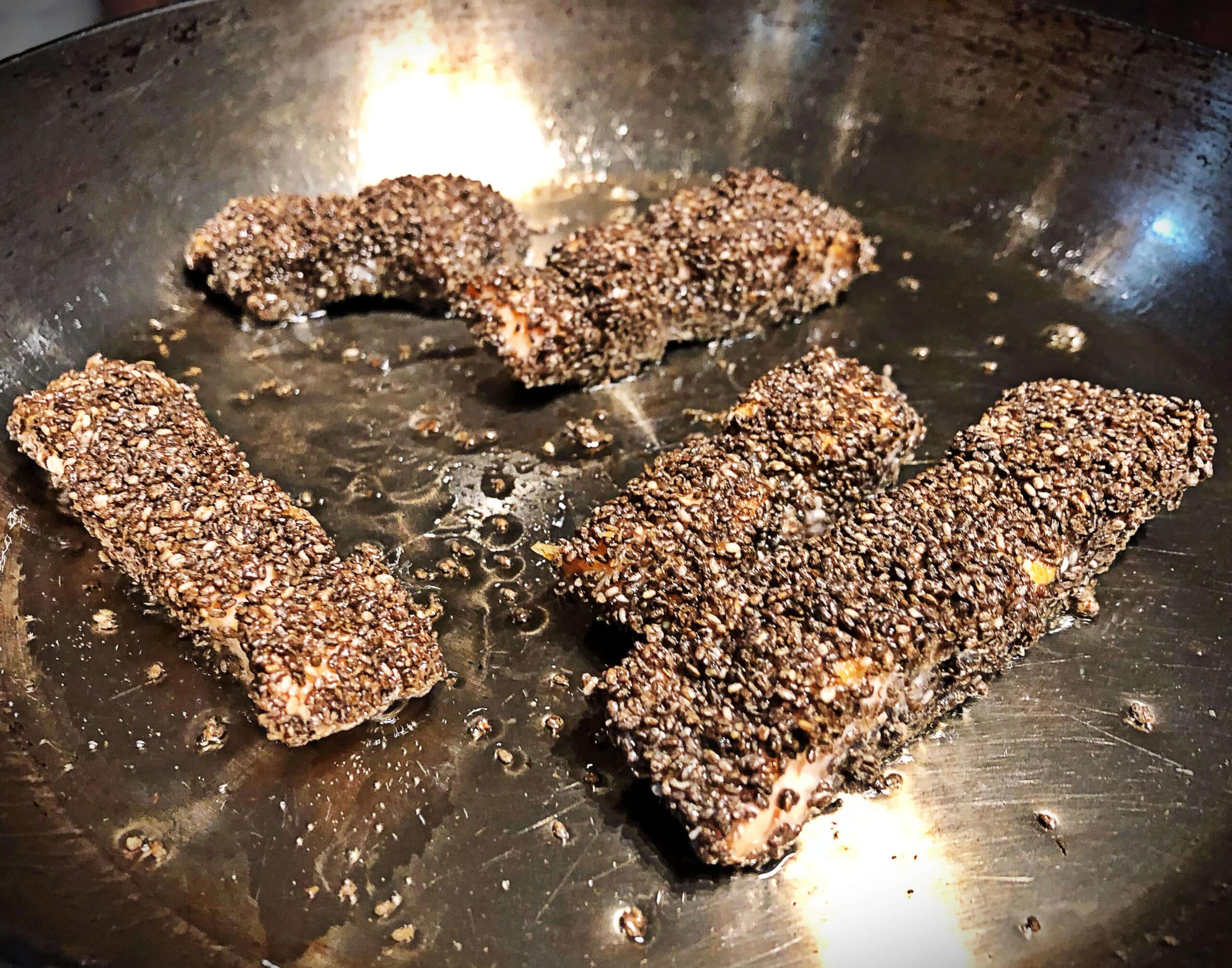 - Place chia seeds in a small bowl. Dip and coat each salmon strip into the chia seeds and coat well. Set coated sides on a small plate and season with a pinch of salt, 1/8th to ¼ tsp. total.