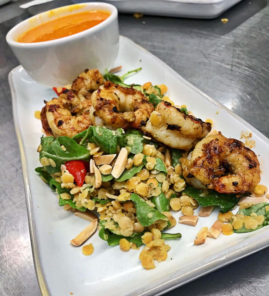 SESAME GRILLED SHRIMP WITH SPINACH AND LENTIL SALAD
