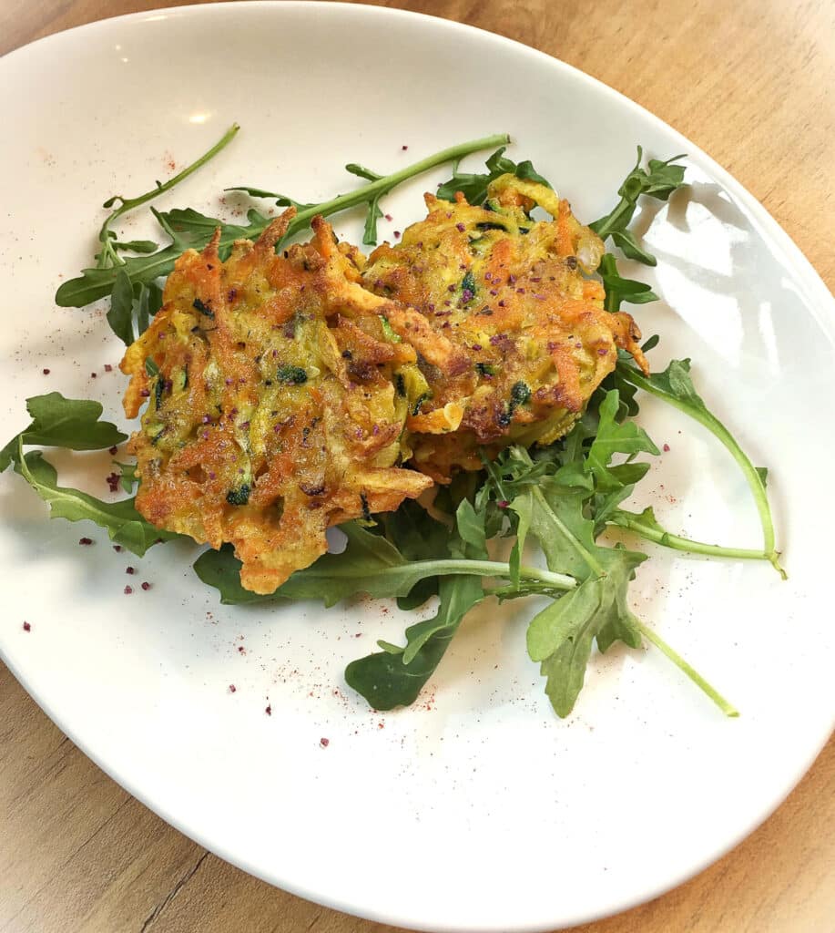 These fritters are a little lower than protein than other vegetable based patties; however, they can easily be changed to integrate more protein or serve these over a bed of greens, cooked white beans and avocado.