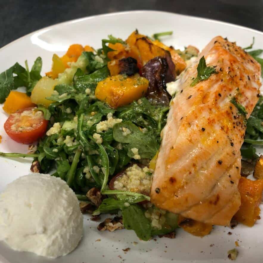 ROASTED VEGETABLE ARUGULA SALAD WITH BAKED SALMON