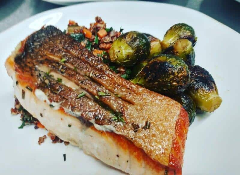 PAN SEARED SALMON WITH ROASTED BRUSSELS SPROUTS